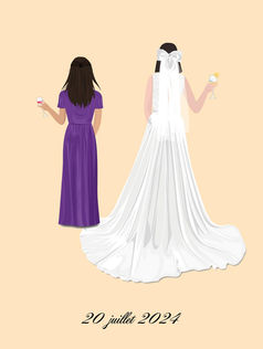 Demande de la part d'une jeune mariée, qui souhaitait se faire représenter de dos avec chacune de ses demoiselles d'honneur. L'idée était de créer un souvenir unique et personnalisé à offrir le jour J. L'illustration est minimaliste avec une palette de couleurs douce et harmonieuse, pour un rendu élégant et épuré.